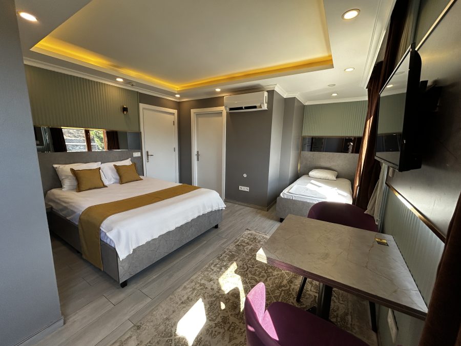 Aile odamız, geniş ve rahat bir konaklama alanı sunar. Aileler için ideal olan bu oda, birden fazla yatak ve geniş oturma alanı ile tasarlanmıştır. Modern olanaklar, temiz banyo ve ekstra depolama alanları ile donatılmıştır. Hem çocuklar hem de yetişkinler için konforlu bir ortam sağlar, ailenizle keyifli bir konaklama deneyimi yaşamanıza yardımcı olur.